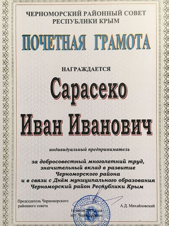 01.07.2018 — Почетная грамота Черноморского районного совета "За добросовестный многолетний труд,