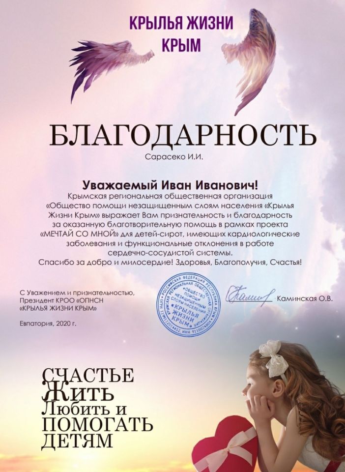 19.12.2018 — Благодарственное письмо от Администрации Черноморского района за поддержку детей с