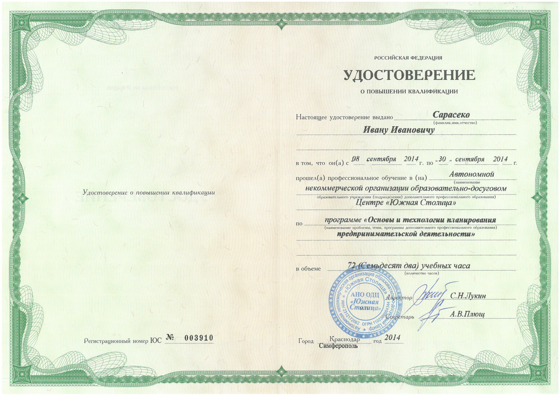 02.11.2012 — Грамота Черноморского территориального центра социального обслуживания за личный